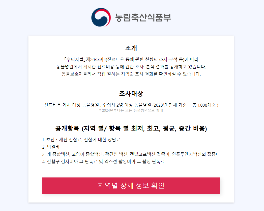 동물병원마다 치료비가 다르게 측정되어 불편했던 점을 개선하기 위해 농림축산식품부가 애완동물병원 치료비 공개 시스템을 운영하고 있습니다. 동물병원 내 치료비 상황을 투명하게 공개함으로써 시민들이 진료비를 비교하고 합리적으로 판단할 수 있도록 지원하고 있습니다.