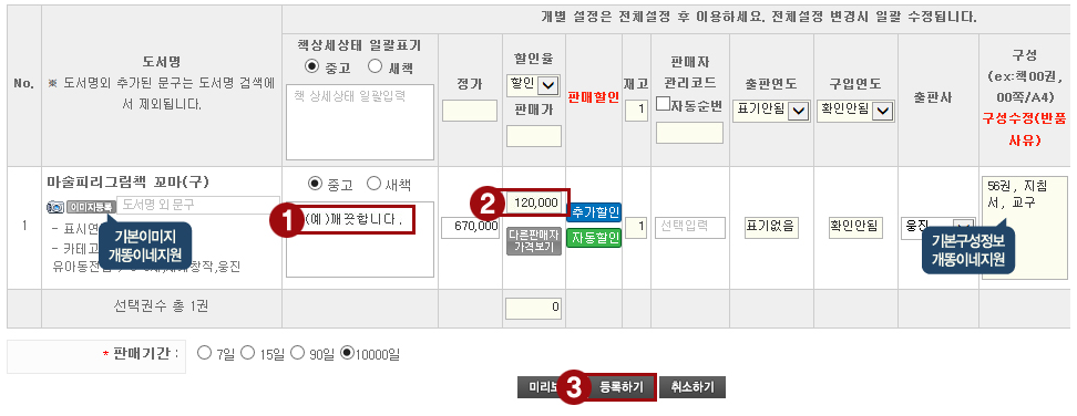 판매 가격을 설정해야 하는데 이때, 현재 사이트에서 비슷한 책이 판매되는 가격을 참고하여 적절한 가격을 설정하는 것이 좋습니다.