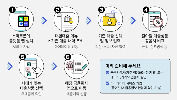 갈아타고 싶은 금융사를 이미 정했다면 해당 금융사의 앱에 직접 접속하시면 됩니다. 금융기관의 앱을 통해서는 자사 상품으로의 대환만 가능하며, 별도의 플랫폼 앱 설치나 마이데이터 가입이 필요하지 않습니다. 금융기관의 앱을 통해 제공되는 대출 조건을 검토하고, 어떤 조건이 유리한지 확인한 후에 계약을 진행하시면 됩니다.