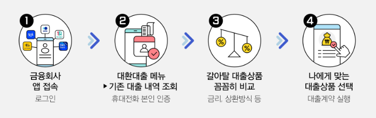 대환대출 메뉴에서 기존 대출 내역을 조회하며 (마이데이터 가입 필요), 기존 대출을 선택하고 정보를 입력합니다. 그 후 갈아탈 대출 상품을 비교하고, 자신에게 맞는 대출 상품을 선택한 뒤 해당 금융기관의 앱으로 이동합니다.